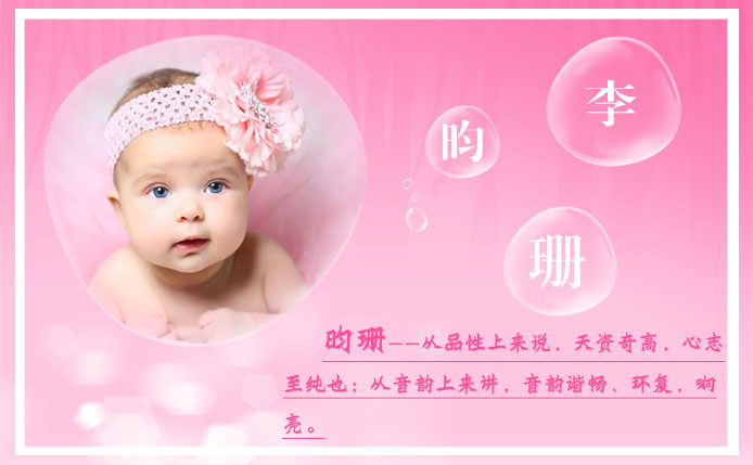 珊者,珊瑚也,华美艳丽,多姿多彩,贵重福气,喻珍奇之物或人才也。此处喻女孩端庄秀丽,灵妙动人,一生平安福泽,吉祥灵瑞,聪慧曼妙也。宋玉《神女赋》曰:“动雾縠以徐步兮,拂墀声之珊珊。”明·归有光《项脊轩志》中曰:“三五之夜,明月半墙,桂影斑驳,风移影动,珊珊可爱。”此字在姓名学中显清秀伶俐,有才能理智,吉祥昌隆之象。珊者,光泽闪烁,灼灼其华也,珊者,聪颖过人,奇巧无比也,珊者,吉祥如意,永享福禄也,珊者,清灵秀毓,秀外慧中也。